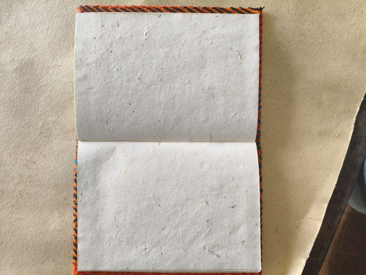 "This stunning notebook diary is adorned with vibrant orange and blue Kheta embroidery, blending traditional artistry with a bold, modern look. Perfect for writing, journaling, or gifting with style."