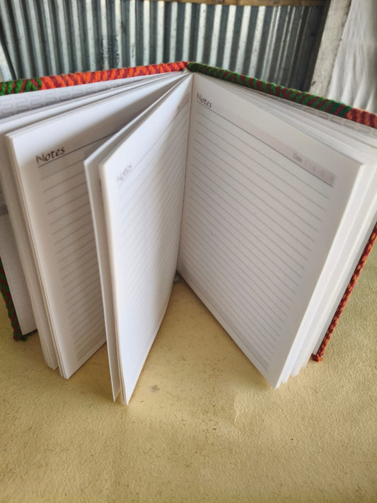 "Bright and beautiful, this notebook diary features traditional Kheta embroidery in vibrant orange and green tones. A perfect blend of culture and creativity, ideal for journaling, sketching, or gifting."