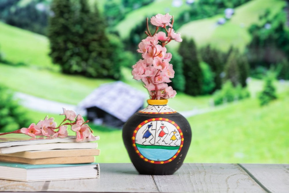 Handmade Terracota Earthen Innovation Clay Warli printed Beaded designs Black Flower Vase for Indoor Home Decoration, Resort Decoration, Pen Pot and Ideal for Gifting .