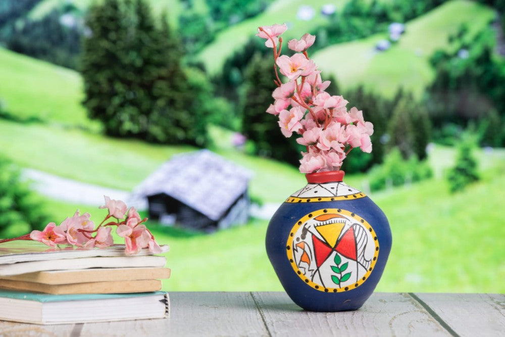 justifyHandmade Terracota Earthen Innovation Clay Warli printed Tribal designs Brown Flower Vase for Indoor Home Decoration, Resort Decoration, Pen Pot and Ideal for Gifting .