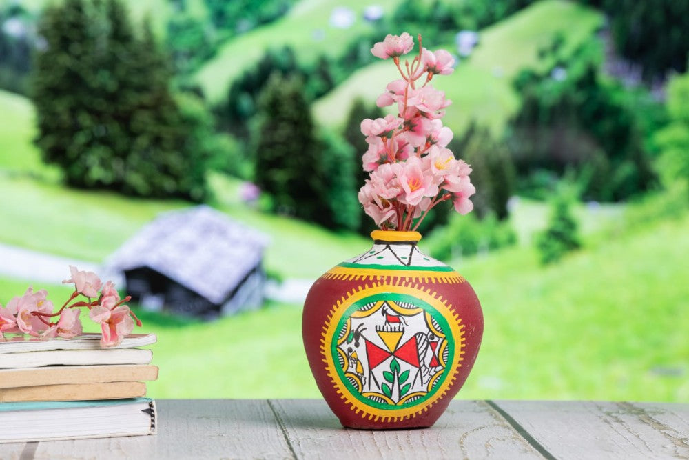 justifyHandmade Terracota Earthen Innovation Clay Warli printed Tribal designs Brown Flower Vase for Indoor Home Decoration, Resort Decoration, Pen Pot and Ideal for Gifting .
