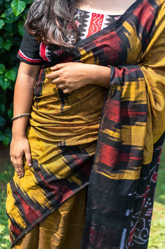 The broad border with flower ikat and red temples is the signature of this elegant saree. Add to it the flower ikat anchal, means the anchal has all sorts of Odisha motifs such as flowers, waves, creepers and we have a masterpiece ready to charm all! The Khandua weavers have made this unique piece with lot of love with their dexterous skilled hands.