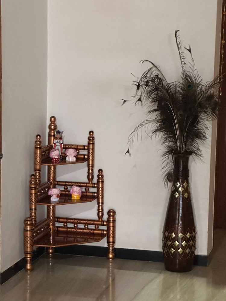 A traditional handcrafted corner rack from Sankheda, Gujarat, featuring the region's signature lacquerware craftsmanship. This piece is intricately designed with a red lacquer finish, showcasing the vibrant and ornate detailing characteristic of Sankheda furniture. Ideal for adding a touch of cultural elegance to any corner of your home.