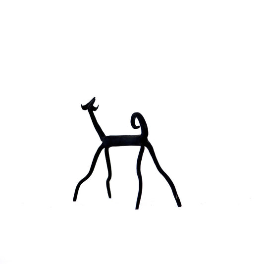 The Standing Dog Figurine of Bastar Iron Art is a remarkable sculpture created by talented artisans in the Bastar region of India. Crafted from iron, this distinctive artwork portrays a standing dog with its head tilting backward, conveying a sense of curiosity and charm. The figurine exemplifies the rich artistic heritage and intricate craftsmanship of Bastar, making it a captivating piece that reflects the region's cultural and artistic traditions.