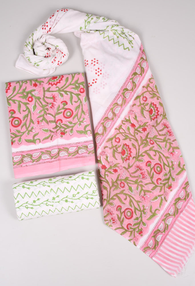 This exclusive multicolour bagru hand block printed cotton suit material features intricate traditional patterns, crafted from soft and comfortable cotton fabric. It includes a matching cotton dupatta, perfect for a stylish and elegant look. Ideal for festive occasions and cultural events.