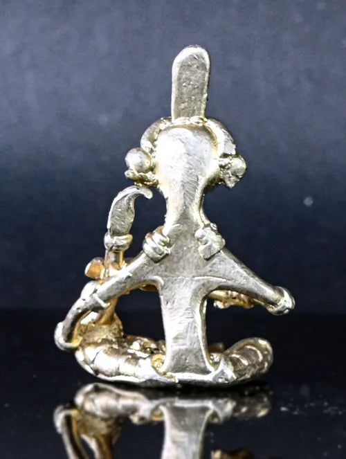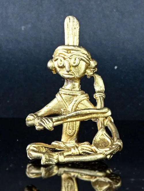 A Bengal Dokra Adivasi man sits cross-legged, playing the Banam, a traditional tribal string instrument. Crafted in brass, the sculpture captures his focused expression and rhythmic posture. This intricate piece reflects the soulful connection between music and tribal life, preserving Adivasi traditions through the enduring beauty of Dokra artistry.