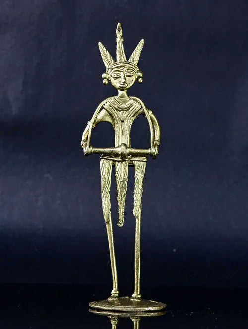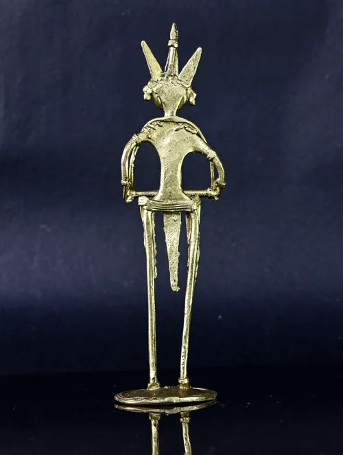 A Bengal Dokra Adivasi man, sculpted in brass, plays the Madol, a traditional tribal drum. His poised stance and detailed attire capture the rhythm of festive village life. This handcrafted piece reflects the spirit of Adivasi music and celebrates the community’s rich cultural heritage through timeless Dokra craftsmanship.
