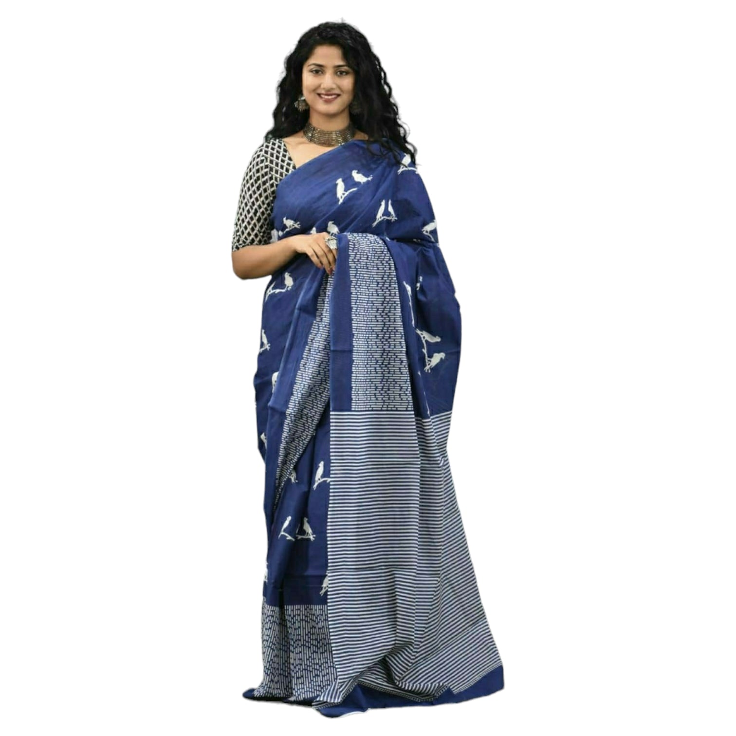 The Blue Colour with White Birds Bagru Print Saree evokes serene elegance with its tranquil hues and intricate design. The deep blue background symbolizes calmness and depth, while the delicate white birds add a touch of purity and grace. The Bagru print technique, originating from Rajasthan, India, lends an artisanal charm, showcasing traditional craftsmanship. This saree is a fusion of timeless beauty and cultural heritage, perfect for those seeking sophistication and tradition in their attire.
