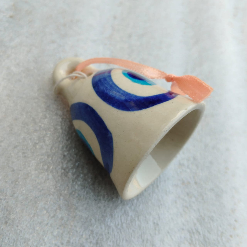 Blue Pottery Hanging Bell – a handcrafted decorative piece featuring intricate designs and vibrant colors. Perfect for adding a traditional touch to your home, garden, or festive décor. Lightweight and durable, it produces a soft, soothing chime, making it an elegant choice for gifting or enhancing any space with artisanal charm.