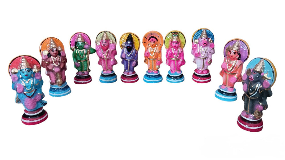 Celebrate the spirit of Navaratri with our exquisite Dasavatharam Golu Set, a stunning display of the ten avatars of Lord Vishnu. This intricately crafted set is designed to add a touch of tradition and elegance to your festive decorations.